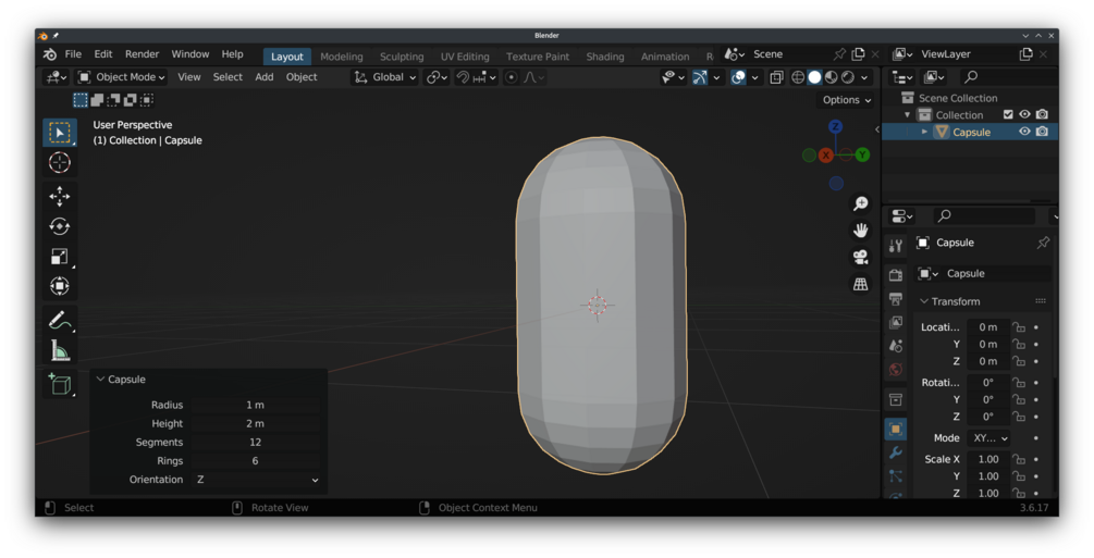 This add-on adds a new mesh primitive to Blender: the Capsule. A capsule is a cylinder with hemispherical caps on both ends, resembling a pill or capsule shape. This shape is commonly used in 3D modeling, game development, and physics simulations.